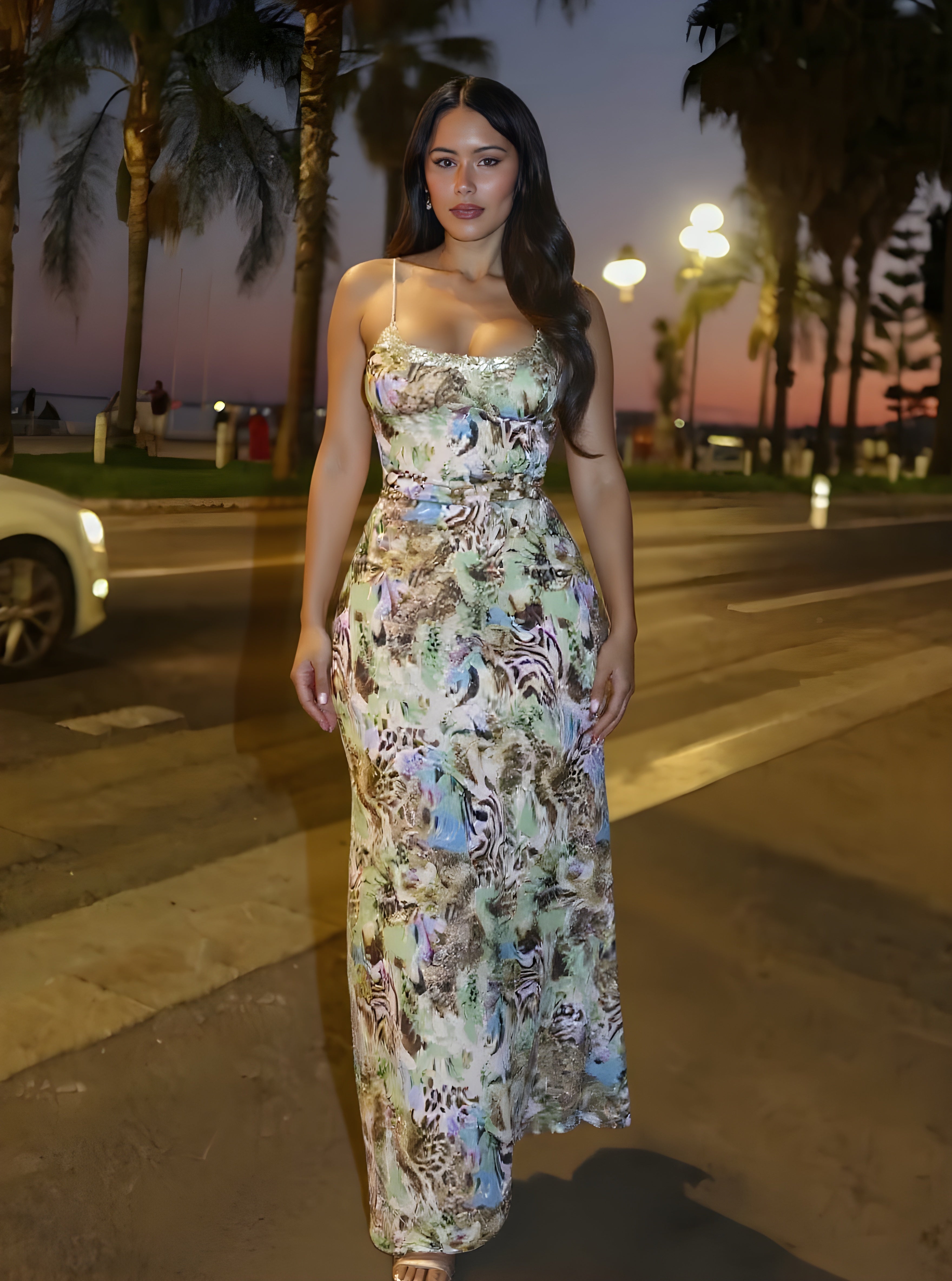 Autumn Dresses Women's 2025 Sexy Full Print Spaghetti Strap Square Neck Draped Midi Dating Wrap Dresses