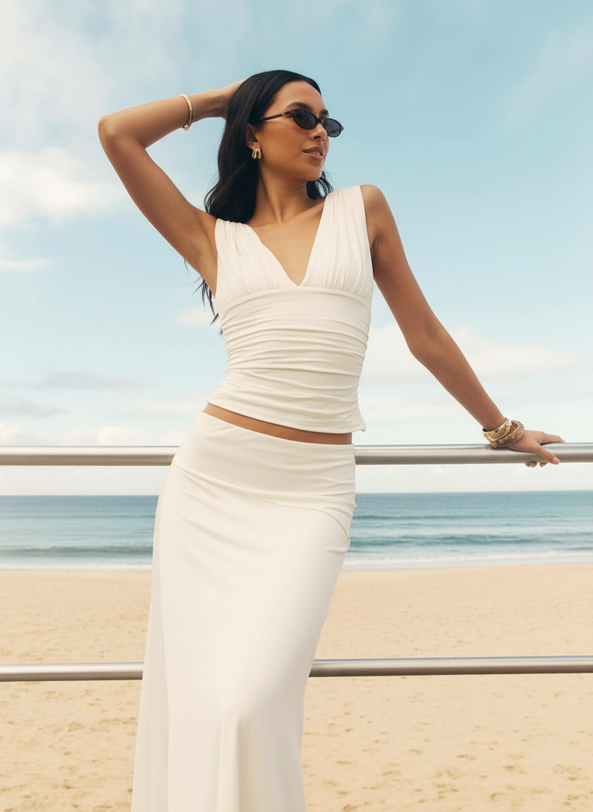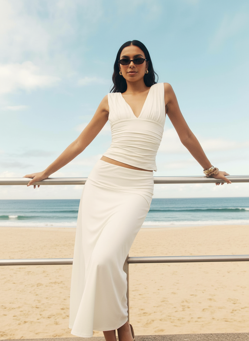 Each piece feels like a postcard from somewhere warm — airy linens, soft cottons, sun-touched tones that move easily from the beach to the city.