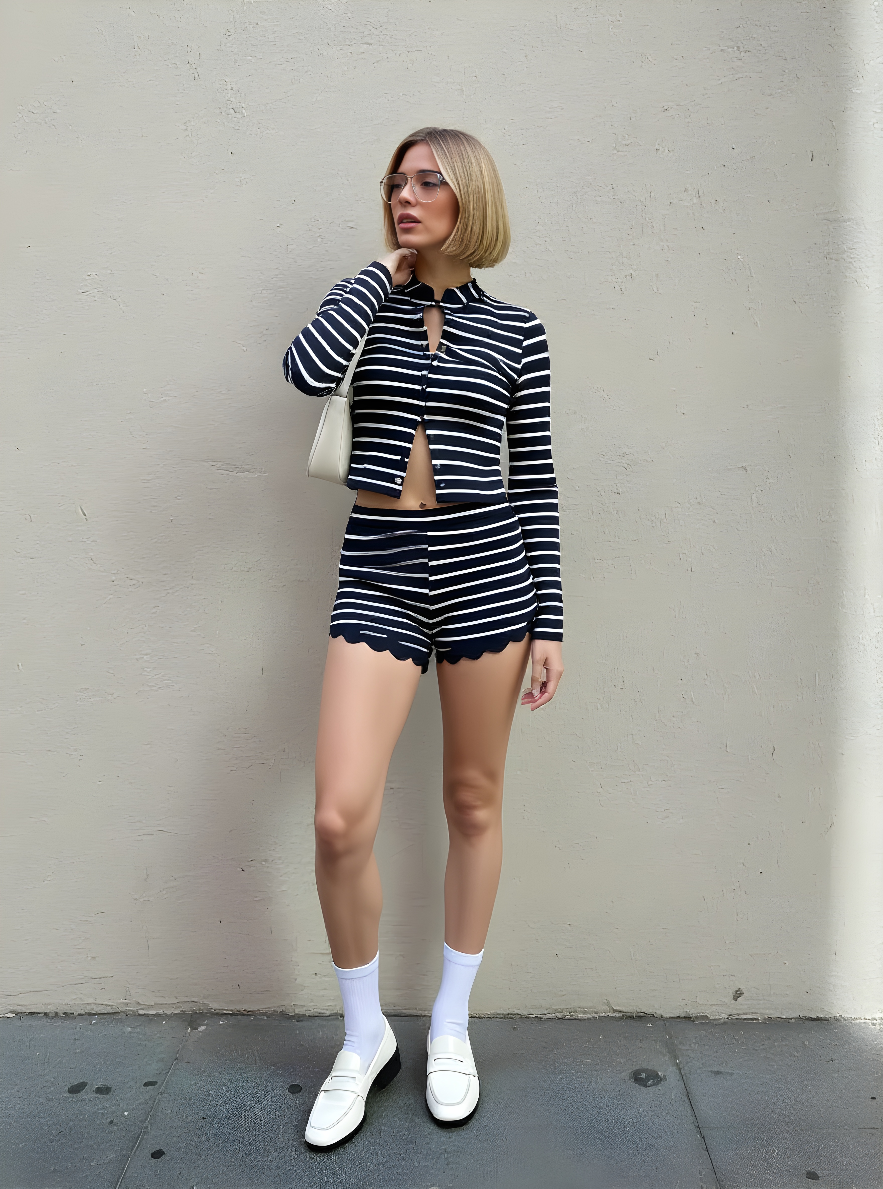 Women's Sets Autumn Chic 2025 Stripes Long Sleeve Stand Collar Button Front Blouses Casual Shorts Sets